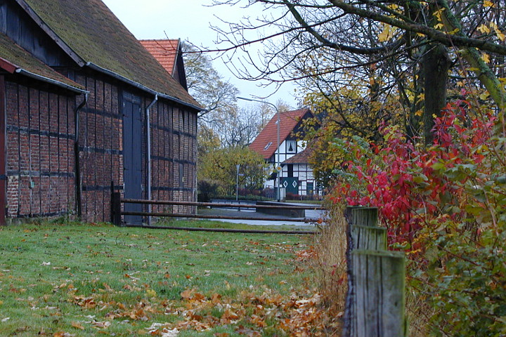 Herrliche Herbstfarben sorgen auch bei trübem Wetter dafür, dass unser Ort sehenswert ist. Links der Hof Böhmer, im Hintergrund Haus Hinkelmann mit der alten Scheune des ehemaligen Borghofes.