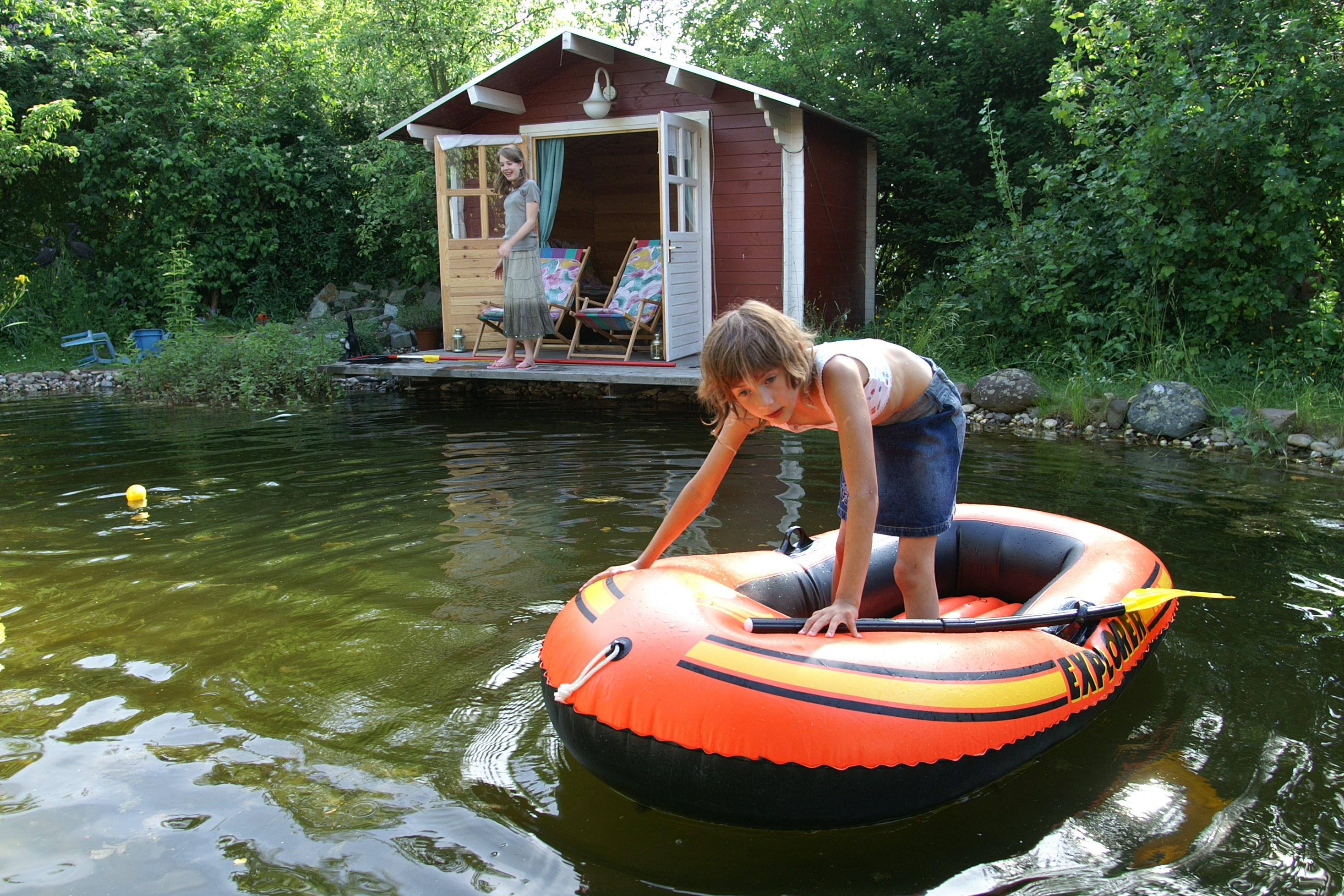 Antje im Gummiboot auf einem Meiningser Gartenteich.