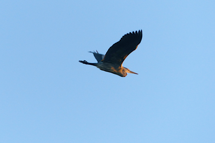 Ein großer Vogel. Ab in den Sonnenuntergang. Hauptsache nicht zu unserem Gartenteich.