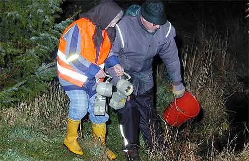 Elisabeth und Heinz-Dieter Brunstein abends an der Straße zwischen Meiningsen und Soest. Sie helfen Kröten über die Piste, retten jedes Frühjahr Leben. Fotos: Axel Heymann