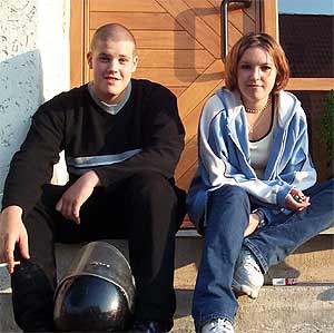 Der Tombola-Hauptgewinner Kristian Frieling (links mit der Fluppe) des Meiningser Erntedankfestes 1999. Es wird gemunkelt, die neben ihm sitzende A. F. (rechts mit der Fluppe) würde sich mit ihm den Preis teilen.