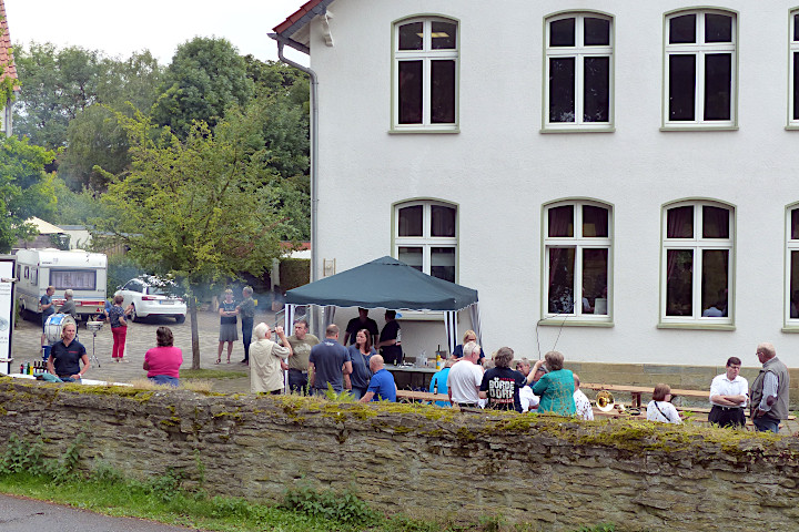 Zum Schwätzchen kommen die Sommerfestgäste nach und nach aus dem Gemeindehaus nach draußen. In der Ferne grollt wieder der Donner. Aber das Wetter hält.