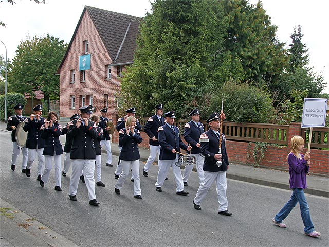 Der Tambourcorps Holzen marschiert auf mit Madleine an der Spitze. Damit es nicht nach Kirmes klingt, ist genau abgesprochen, dass nie zwei in unmittelbarer Nachbarschaft auftretende Vereine gleichzeitig musizieren.