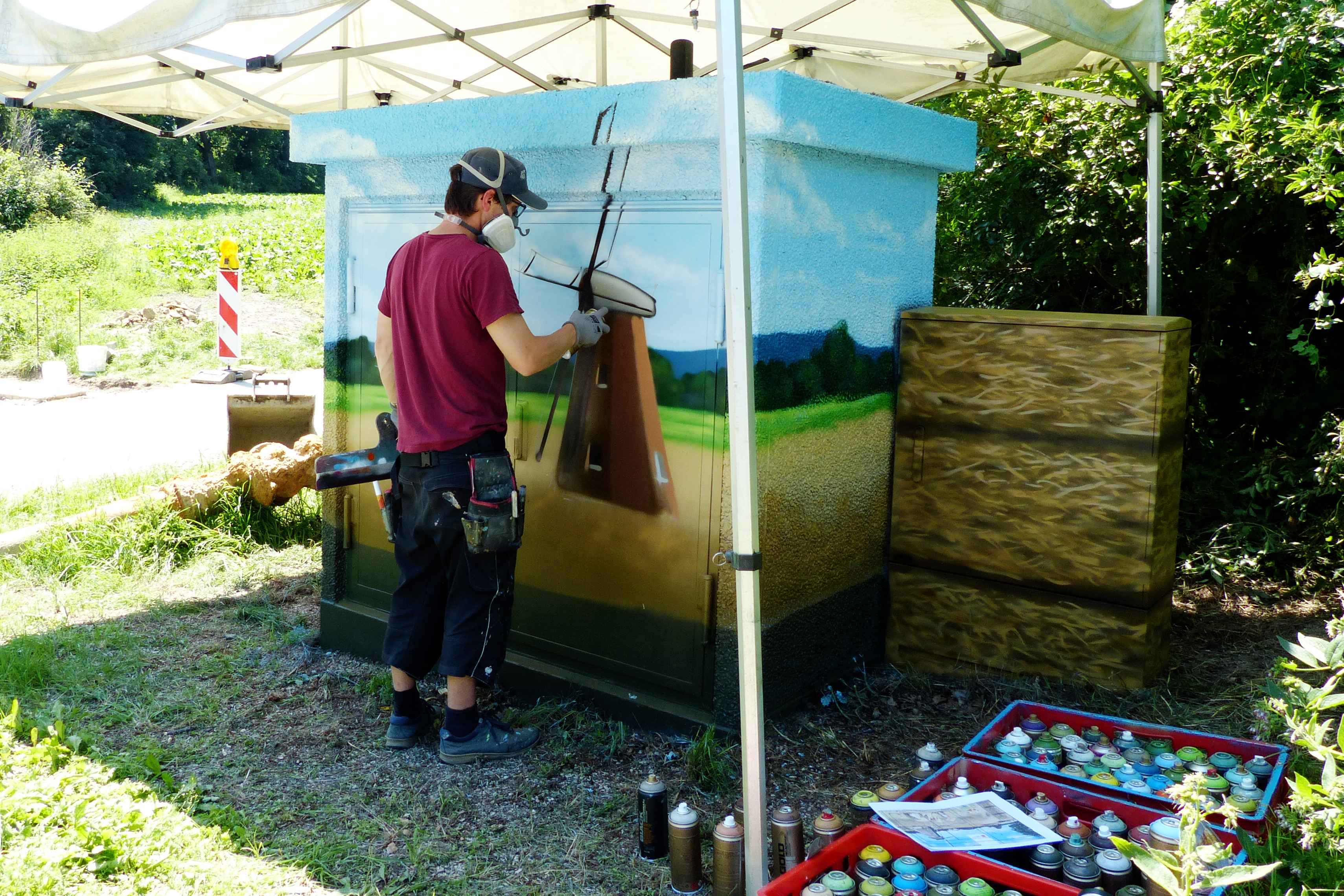 Mit "tausenden" von Sprühdosen zaubern sie eine Landschaft auf unseren Stromkasten.