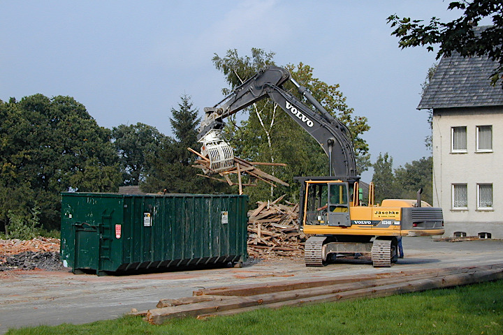Hier hat der Abrissbagger schon ganze Arbeit geleistet. Das Wohnhaus steht plötzlich sehr allein da.