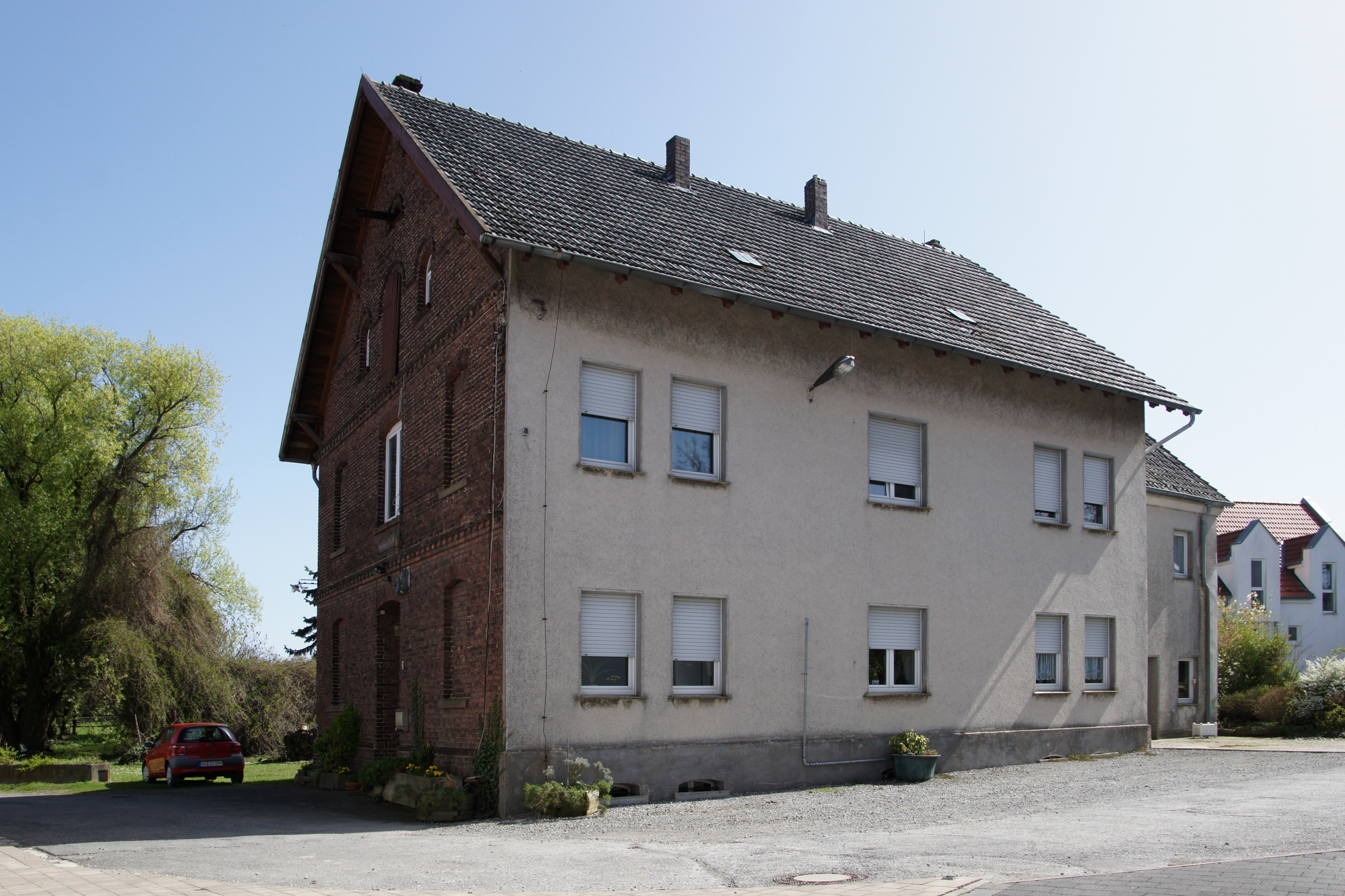 Das mächtige Wohnhaus Blumendeller aus Backstein dominiert den Hof. Dieses Gebäude steht heute immer noch. Zur Hofseite nach Westen ist es hell verputzt.