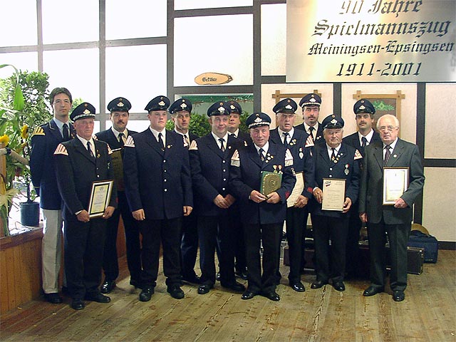 Eine ehrenwerte Gesellschaft: Ehrungen vom Volksmusikerbund NRW zum 90jährigen Bestehen des Spielmannszuges: Markus Brasse (VMB), Ernst Camen, Wilhelm Frieling, Kristian Frieling, Karl-Heinz Frieling, Dietmar Dahnke, Jürgen Kossel, Erwin Kossel, Heinz-Dieter Camen, Reinhard Teuber, Walter Radon, Detlef Grieger und Wilhelm Junker.